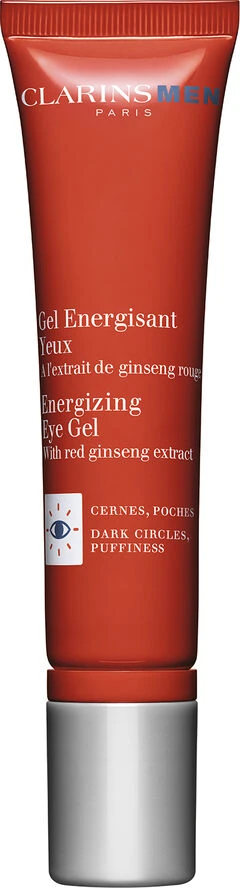 ClarinsMen Energizing Eye Gel genopfrisker området omkring øjnene, reducerer mørke rande og hævelser, fugter og styrker øjenkonturen. Den ultra-forfriskende gel rulles på med den indbyggede tri-ball applikator, der masserer og dræner øjenområdet. Økologisk rød ginsengekstrakt hjælper med at øge hudens energiproduktion i kombination med ekstrakter af bisongræs (økologisk)og gymnema, som stimulerer huden.