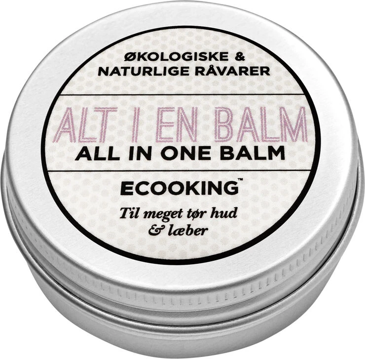 Ekstrem fugtgivende balm til meget tør hud og læber. Ecooking Alt I Én Balm er et multiprodukt, en ekstremt fugtgivende balm til meget tør hud i både ansigtet og på kroppen. Balmen blødgør og beroliger. Alt I Én Balm har mange forskellige anvendelsesmuligheder. Brug den fx til: · Tørre områder/pletter i ansigtet og på kroppen· Tørre hæle og hård hud· Tørre albuer· Tørre hænder· Tørre negle og neglebånd· Tørre og sprukne læber. Indeholder bl.a.: Delisens som hjælper mod kløe og svie. Xpertmoist som er ekstremt fugtgivende og genopbygger selv den tørreste hud. Derudover indeholder den Argan Olie, Shea Butter og naturlig E-vitamin. Dermatologisk testet. Anvendelse: Smør Alt I Én Balm i et tyndt lag på det område, der trænger til intensiv fugt. Giv balmen et øjeblik til at trænge ind. TIP: Hvis du har ekstrem tør hud fx på albuer, hænder eller i ansigtet, smør da Ecooking Alt I Én Balm på et i et tyndt lag og lad virke natten over. På hænderne kan man bruge bomuldshandsker oven på balmen. Findes i to størrelser, 30 ml og 75 ml.