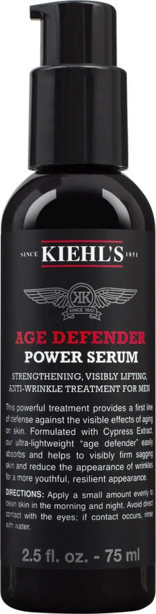 Kiehl’s Age Defender power Serum er Kiehl´s første serum til mænd nogensinde. Den er meget let i konsistensen og absorberes hurtigt i huden. Den opstrammer effektivt huden og reducerer fine linjer og rynker. Indeholder ekstrakt fra cypres, hydrolyserede proteiner og adenosin. Anvendelse: Morgen og aften på ren evt. barberet hud, inden brug af fugtighedscreme.