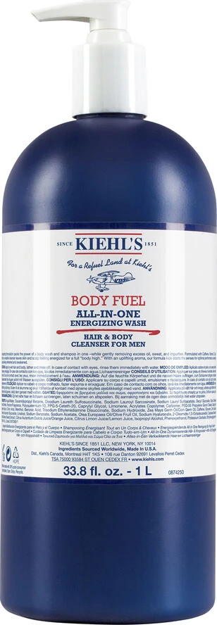 Kiehl’s Body Fuel All-in-One Energizing & Conditioning Wash. En unik 2 i én løsning, som effektivt renser hår og krop. Den fjerner skånsomt overskydende olie, sved og urenheder, skummer dejligt og er en komplet ”head to toe” løsning. Håret bliver nemt at håndtere og den dejlige forfriskende duft efterlader både krop og hår med en fornemmelse af energi. Indeholder bla. Menthol, Zinc, Koffein, C Vitamin og E-Vitamin og indeholder ikke sulfat, silikone.