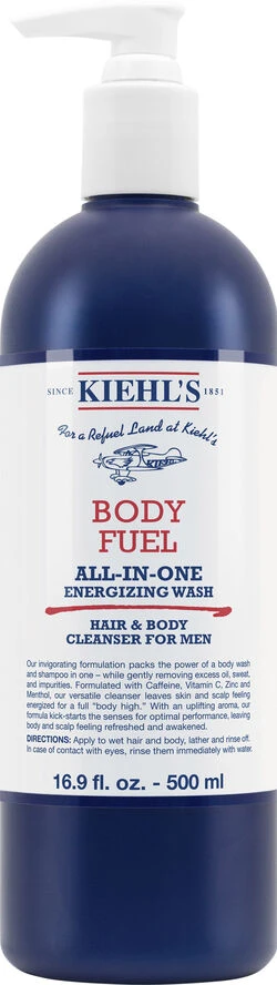 Kiehl’s Body Fuel All-in-One Energizing & Conditioning Wash. En unik 2 i én løsning, som effektivt renser hår og krop. Den fjerner skånsomt overskydende olie, sved og urenheder, skummer dejligt og er en komplet ”head to toe” løsning. Håret bliver nemt at håndtere og den dejlige forfriskende duft efterlader både krop og hår med en fornemmelse af energi. Indeholder bla. Menthol, Zinc, Koffein, C Vitamin og E-Vitamin og indeholder ikke sulfat, silikone.