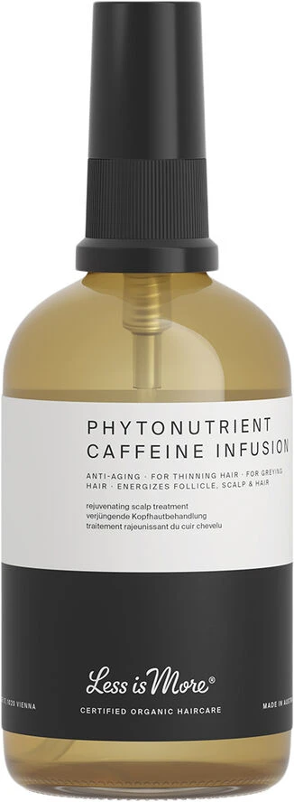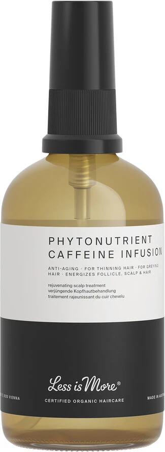 Denne eksklusive og økologiskePhytonutrient Caffeine Infusion er en spray, der gør håret stærkere og fyldigere. Stimulerer follikler, hovedbund og hår. Velegnet til brug mod hårtab.