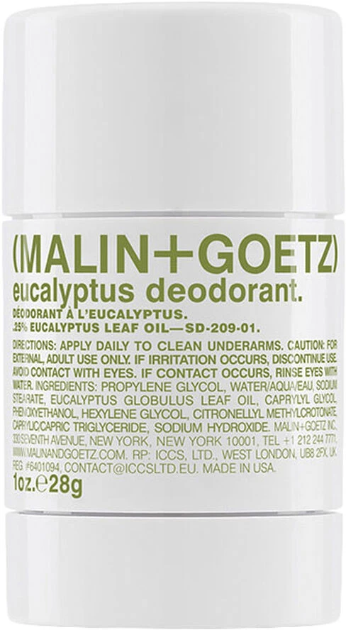 Malin+Goetz â Eucalyptus Deodorant er anti-perspirant og er syntetiseret med forfriskende, naturlig eukalyptus ekstrakt og lugt-neutraliserende citronellyl, der virker effektivt i 24 timer. Malin+Goetz â Eucalyptus Deodorant er egnet til alle hudtyper, især sensitiv hud, og blandingen er sammensat sÃ¥ledes, at den absorberes uden farvning af tøjet, irritation og tilstopning af porer. Malin+Goetz â Eucalyptus Deodorant har naturlig duft og farve, og er fri for aluminium og alkohol.
