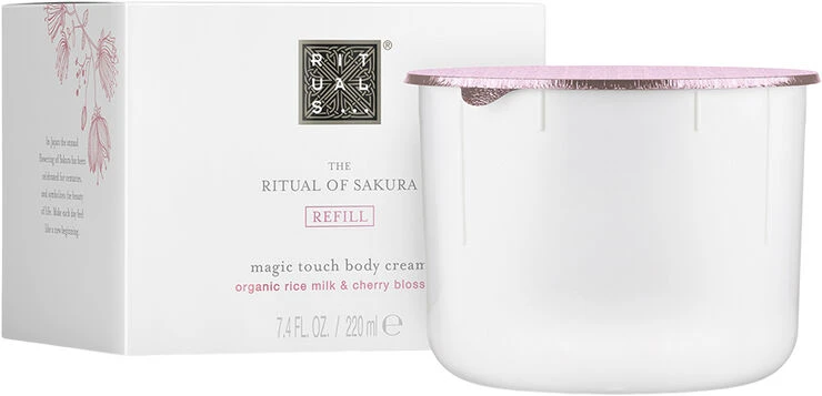 Vælg vores chikke og miljøvenlige refill til The Ritual of Sakura bodycreme og plej dig selv, samtidig med at du passer på miljøet. Spar 70 % i CO2-udledninger, 65 % i energi og brug 45 % mindre vand, samtidig med at du nyder din yndlings-bodycreme med duften af kirsebærblomst og økologisk rismælk. Refillen passer perfekt ned i din originale luksuskrukke.